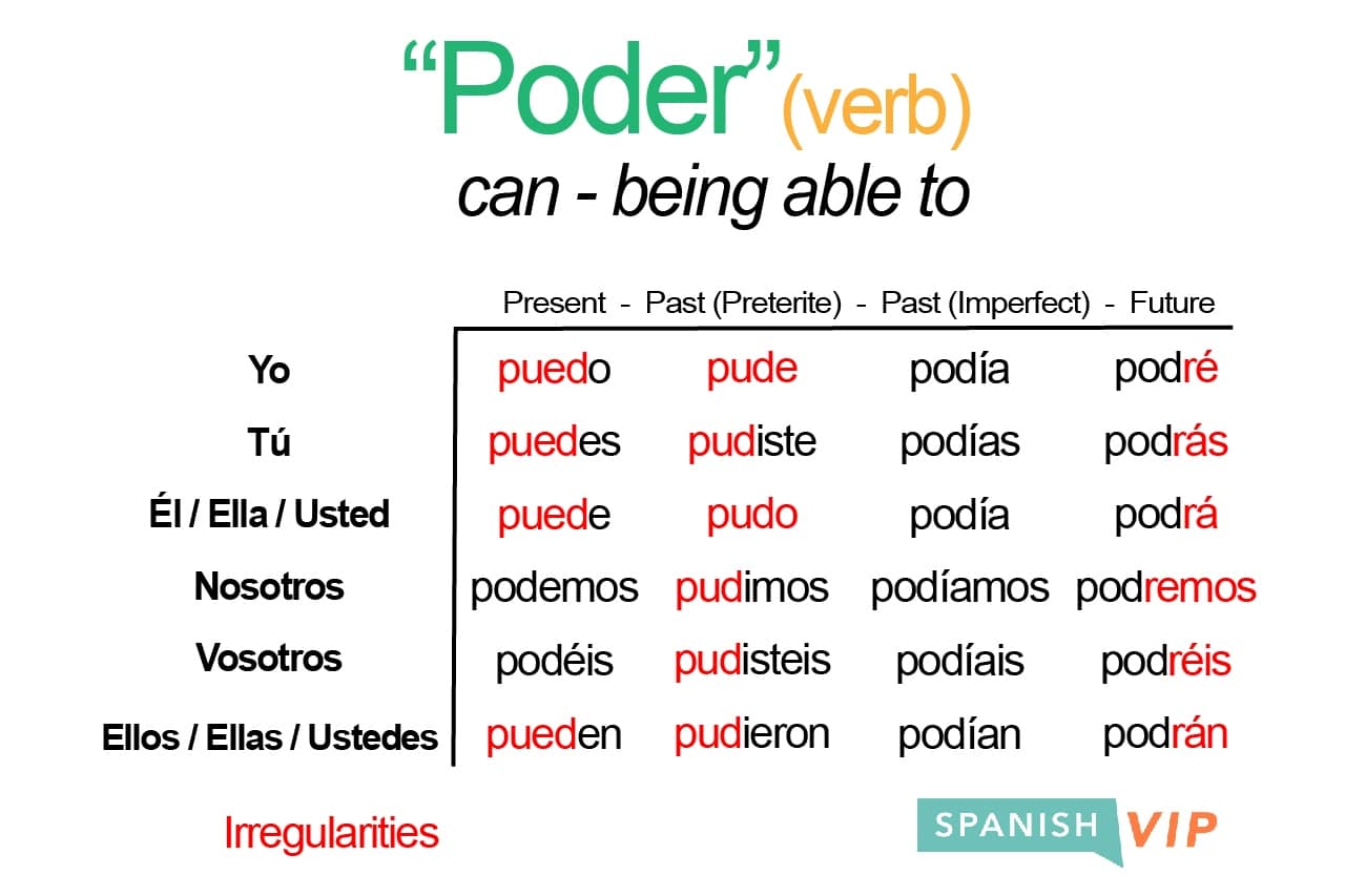 It is an irregular verb, meaning that it does not follow the regular conjugation patterns of Spanish verbs. In the present tense, the conjugation of “poder” is as follows: