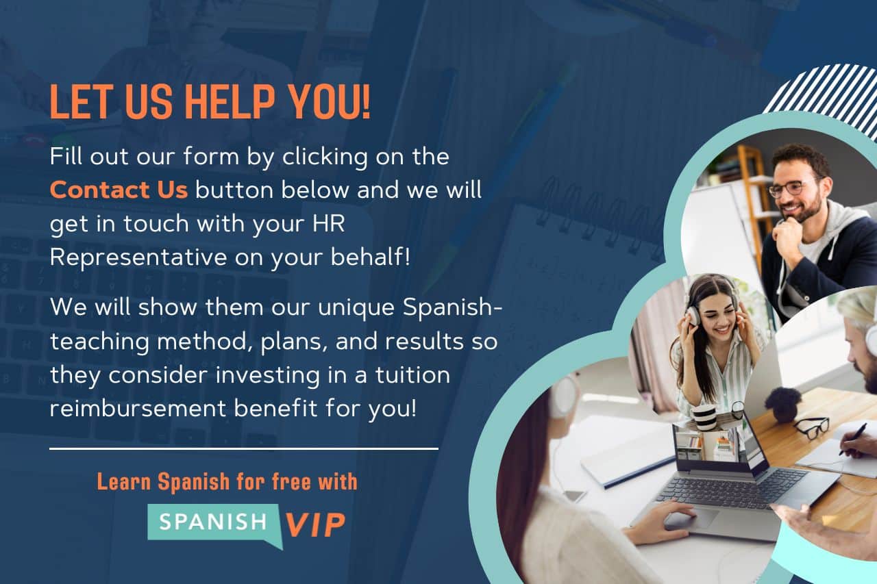 If you’re interested in learning Spanish through SpanishVIP and using a tuition reimbursement program, simply fill out our form and we’ll reach out to your company’s HR department on your behalf.